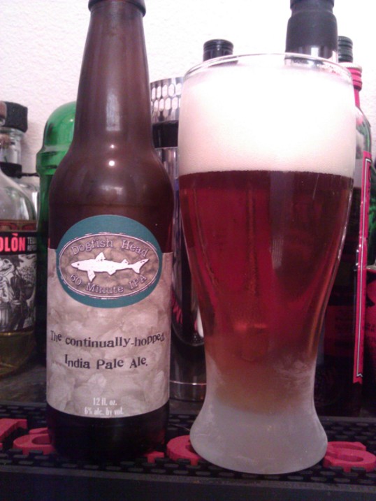 Well hello all, and welcome to another day, another beer. Today we explore that exciting and deep roster that is Dogfish Head and it’s main line: the IPA minute series. Today I try what could be considered their entry IPA: the 60 minute IPA. In case you haven’t been paying attention, these brews get their names from how long they are continuously hopped during their brew time. The 60 minute is a good beer, and in any other line of beers, it’d be a great beer but in a line up that offers a 60, 75, 90, and 120, the 60 really has no chance of raising an eye brow, especially after a 120 (just ask Michael Weaver). The beer pours very well, easily forming a thick foamy head that gives off the aroma of flowers and bit of citrus. The nose of the beer itself is decidedly citrus with a subtle aroma of grass. The beer tastes like a watered down 90 minute with notes of citrus and flower being very subtle that grow into a skunk that lingers mightily at the back of the tongue. Now believe it or not, the 90 and 120 do not have a skunk to them, maybe it’s the time of hops in the tank, maybe it’s just me, but here in the 60 minute, it’s very noticeable. Like I said, this a good beer, but it can’t hold it’s own with the 90 and 120. I do wish I started out with this one a built up the chain but, alas, I can’t change the past so here you go. A good IPA in the Dogfish Head line up and if you’ve never had this one, do yourself a favor, get a bottle of this and 90 minute and compare for yourself, your taste may differ from mine. Till tomorrow friends.
